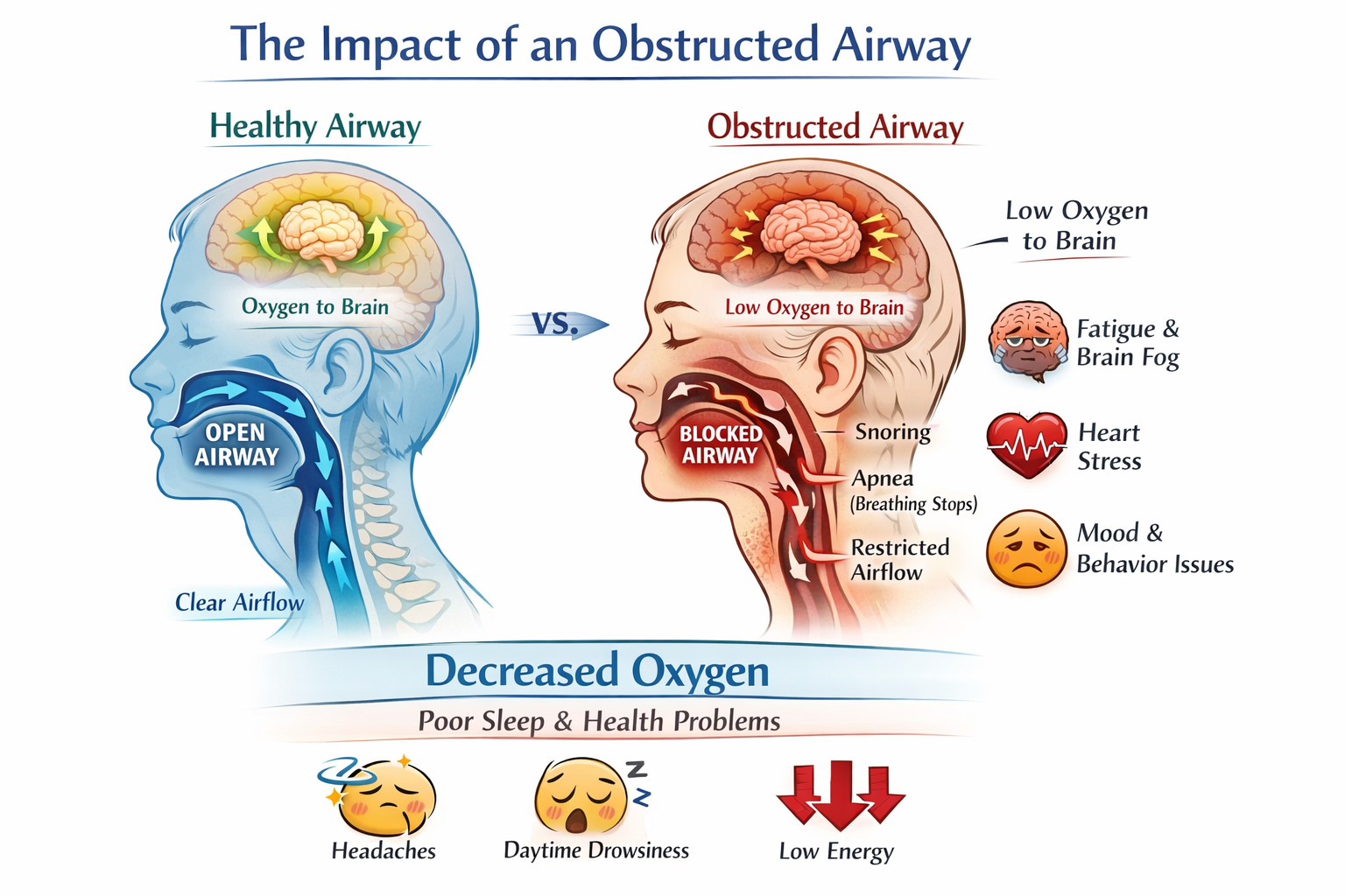 Obstructive Sleep Apnoea — Mild sleep apnoea involves brief pauses in breathing during sleep, which may not always be noticeable. However, it can contribute to daytime tiredness, reduced focus and decreased overall alertness.